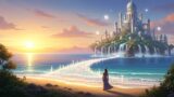 概念的なアート画像。分割画面。一方は、柔らかな太陽の下、穏やかな白い雲に浮かぶミニマルな日本の神社建築。もう一方は、鮮やかな青空の下、高い山頂にそびえる壮大な大理石のギリシャの宮殿。手前には、神話の本を持ち、思慮深い微笑みで空を見上げる30代後半の現代の日本人女性。リアルで幽玄な照明。 日本神話